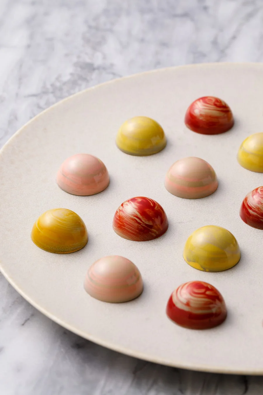 動物性食材を一切使用せず、「ヴィーガンでも美味しさに妥協しない」という思いから生まれたショコラシリーズです。フランス・リノラ社のヴィーガンチョコレートとアーモンドミルクをガナッシュに採用。さらに、アグロエコロジー(生態系に配慮した農業)を推進する生産者から届く、トレーサビリティが明確なフルーツピューレが組み合わされています。産地の個性が際立つ3種類の華やかなフレーバーが楽しめます。